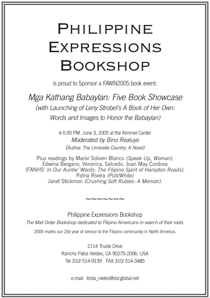 Sponsors: Filipinas Magazine Platinum Media Sponsor Philippine News Silver Media Sponsor Philippine Expressions Bookshop Book Launching Sponsor Co-sponsored by: Claro R. Umali, Allstate Insurance Agent Goldilocks, Clarmil Manufacturing Paradigm International Productions and Entertainment, Inc. Links: Previous FAWN conference info and organizers found online: Filipino Women's Network, San Francisco |